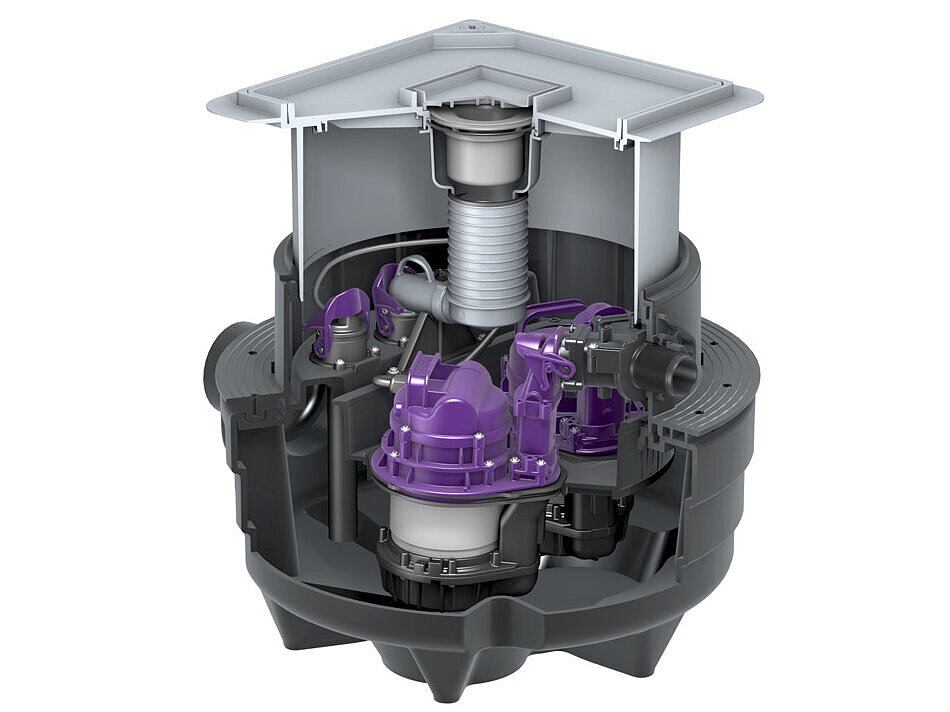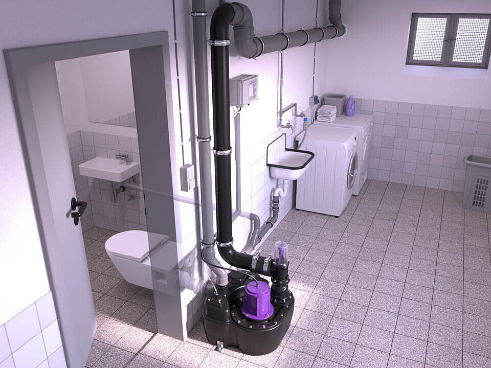 Lifting stations are always essential when waste water accumulates below the backwater level. Their strength lies in overcoming gravity: if there is no natural gradient to the sewer, they lift the wastewater via the backwater loop so that it can flow into the sewer system. In this way, they reliably prevent water from being pushed back into the building during extreme weather events.